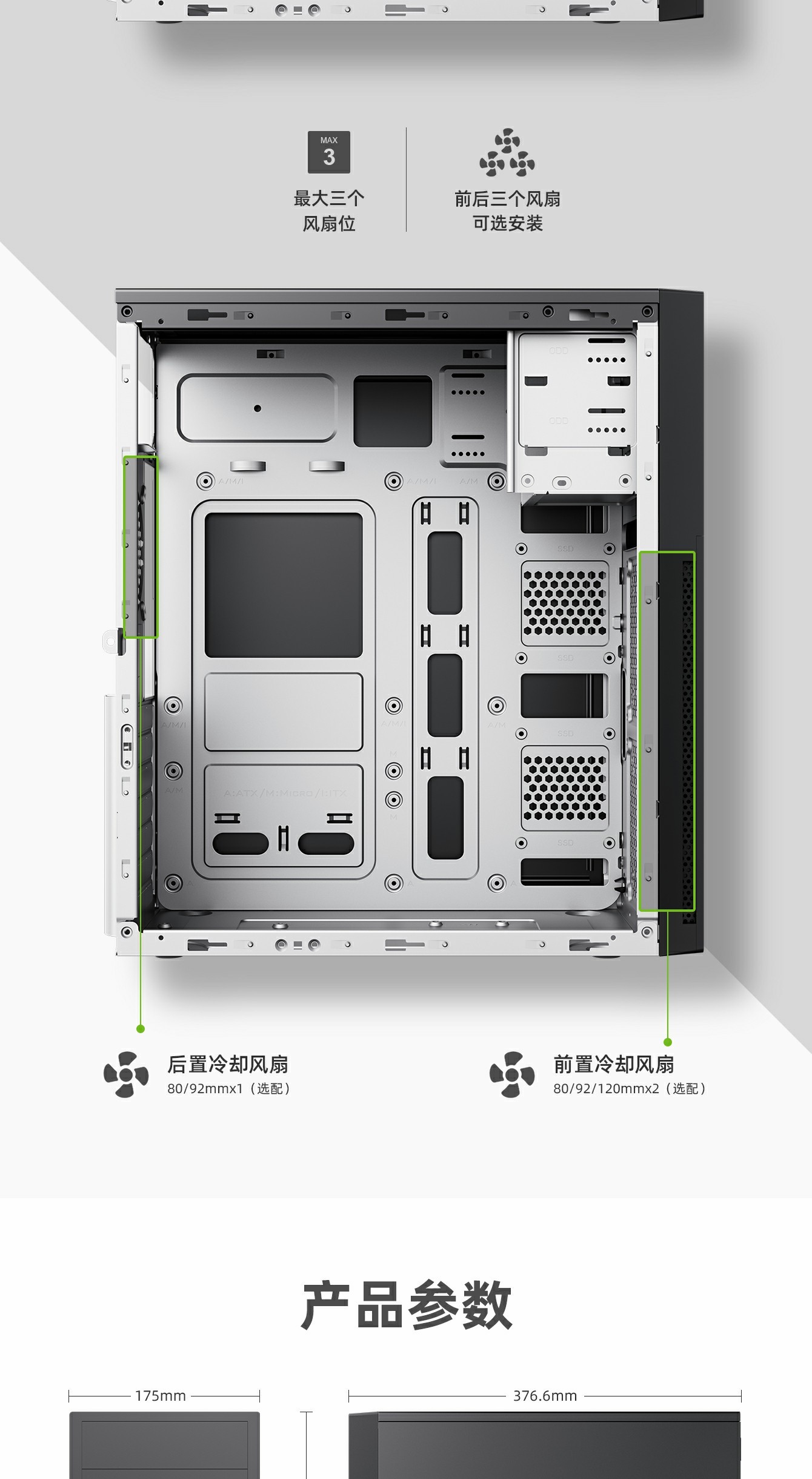 | Cooling Fan Support | Front | 2x120/92/80mm (Fan optional) |