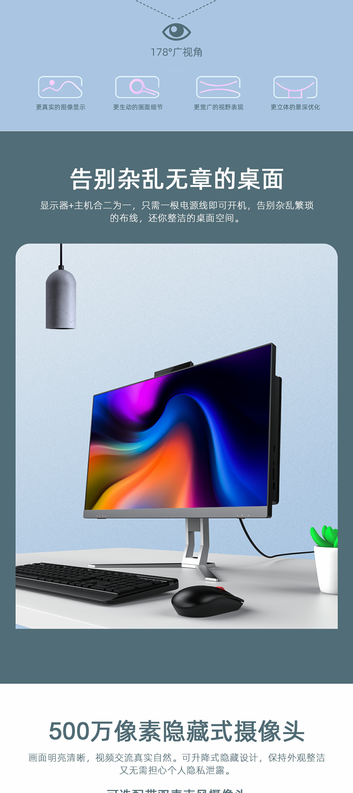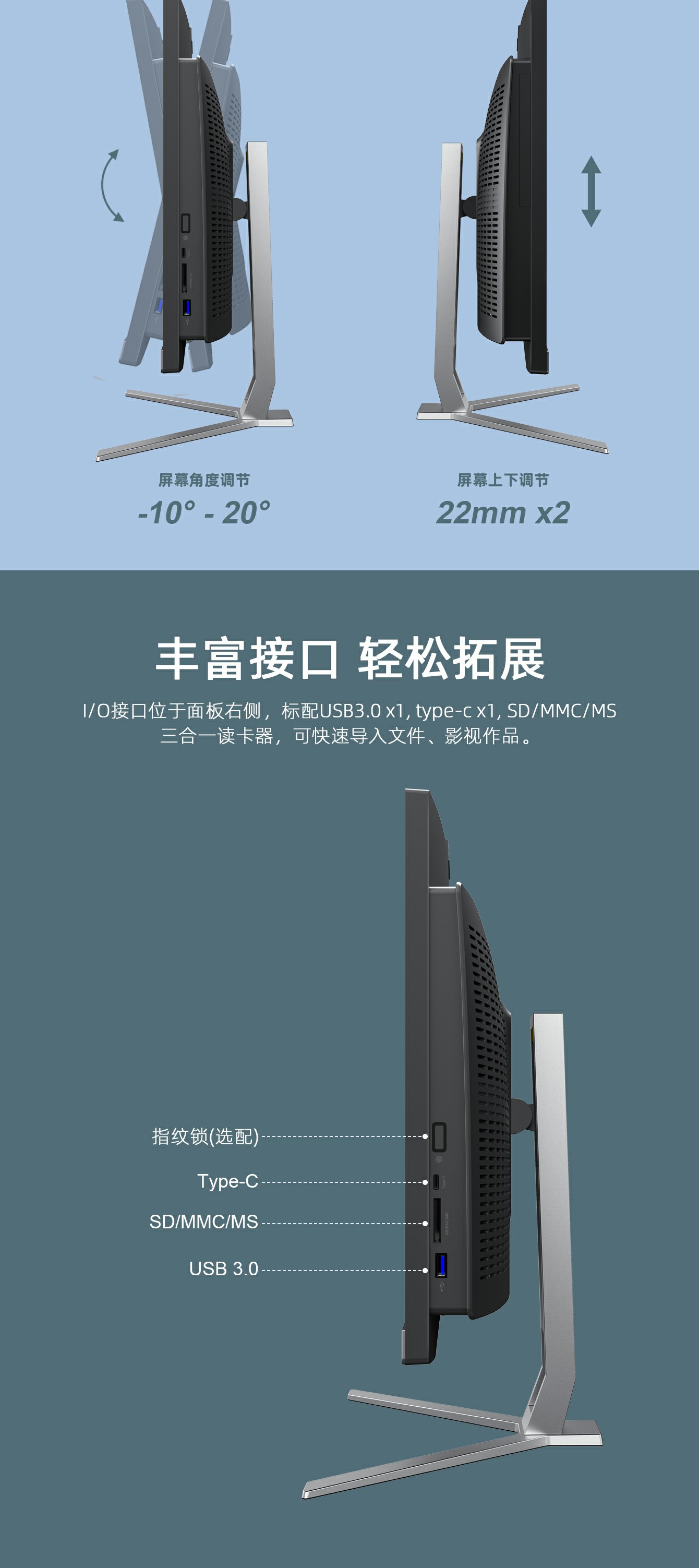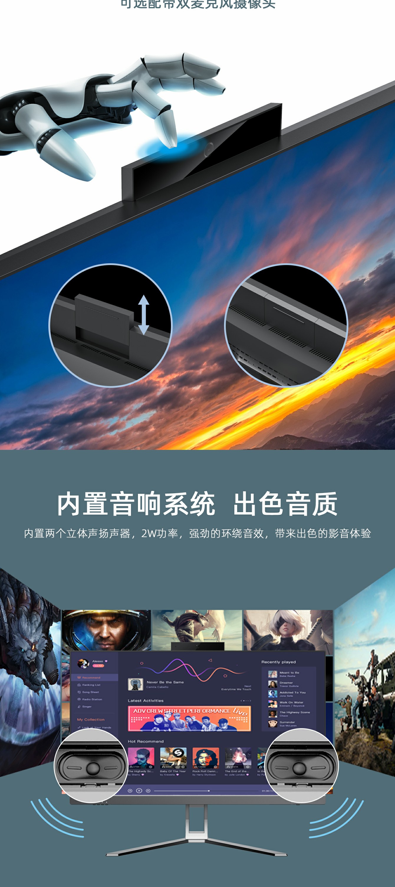 3.可调节支架:屏幕角度调节-5度至25度,上调高度22mm*2两个档位; 4.抽拉隐藏式500W高清摄像头