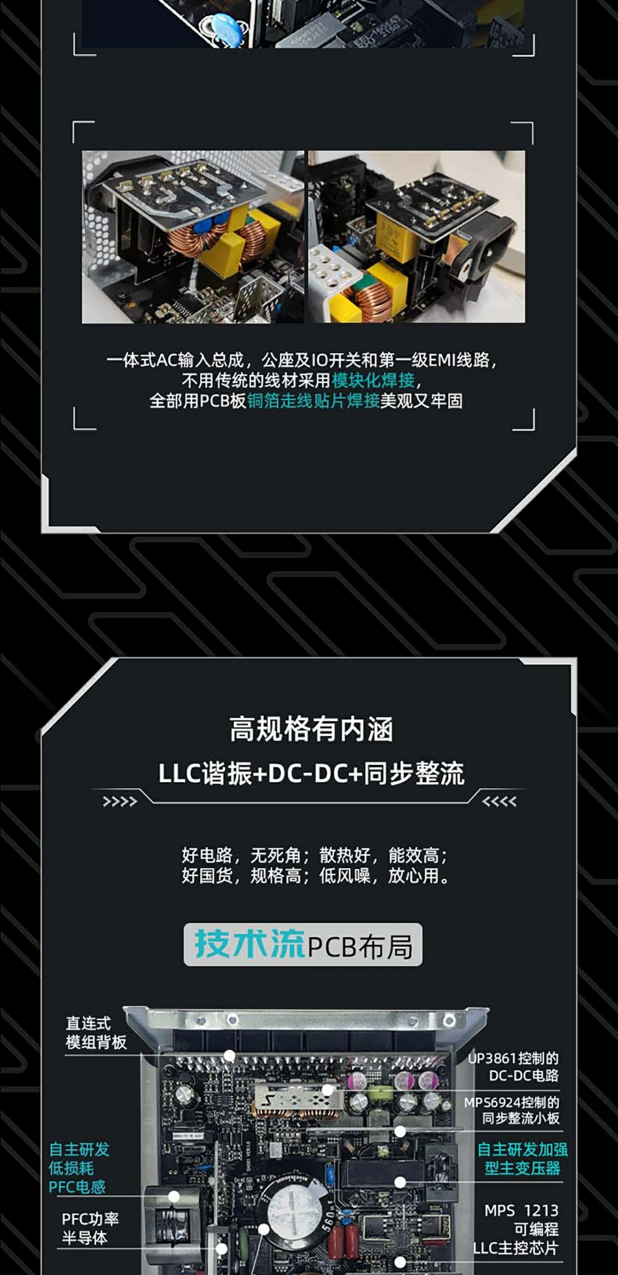 ?LLC主功率管采用纯铜镀锡铜片三面立体式散热设计--自主研发技术核心,提高电源的转换效率。