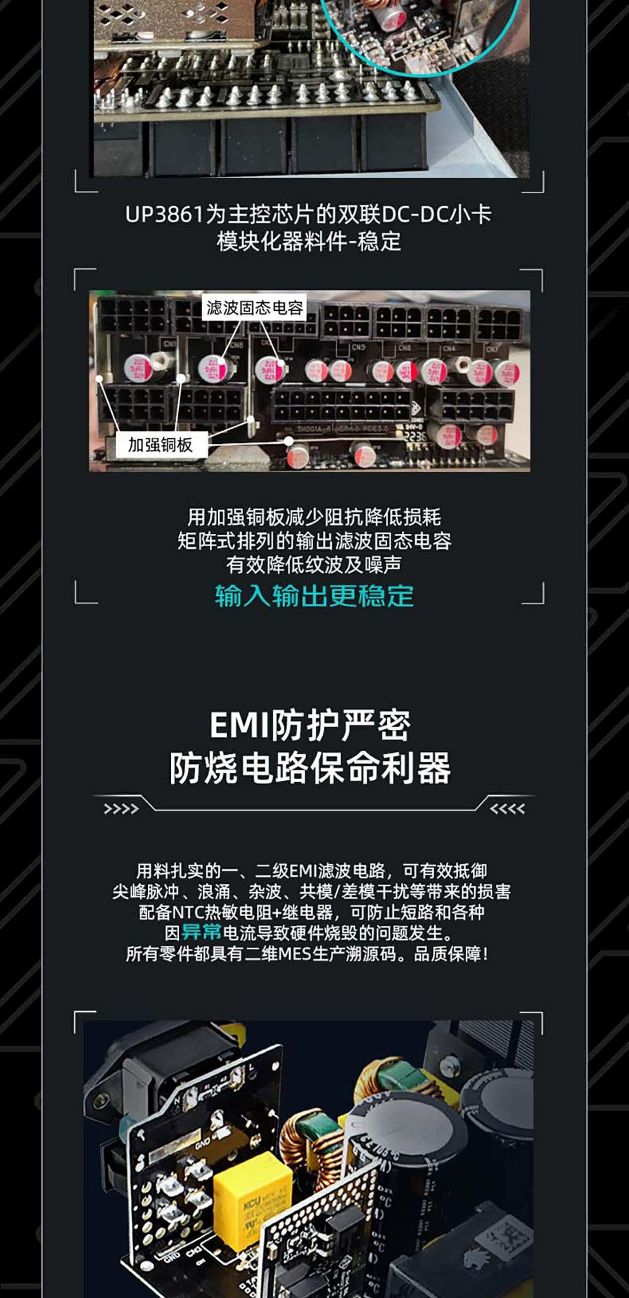?模组电源接口输入,矩阵式排列的输出滤波固态电容有效降低纹波及噪声,用加强铜板减少阻抗降低损耗。