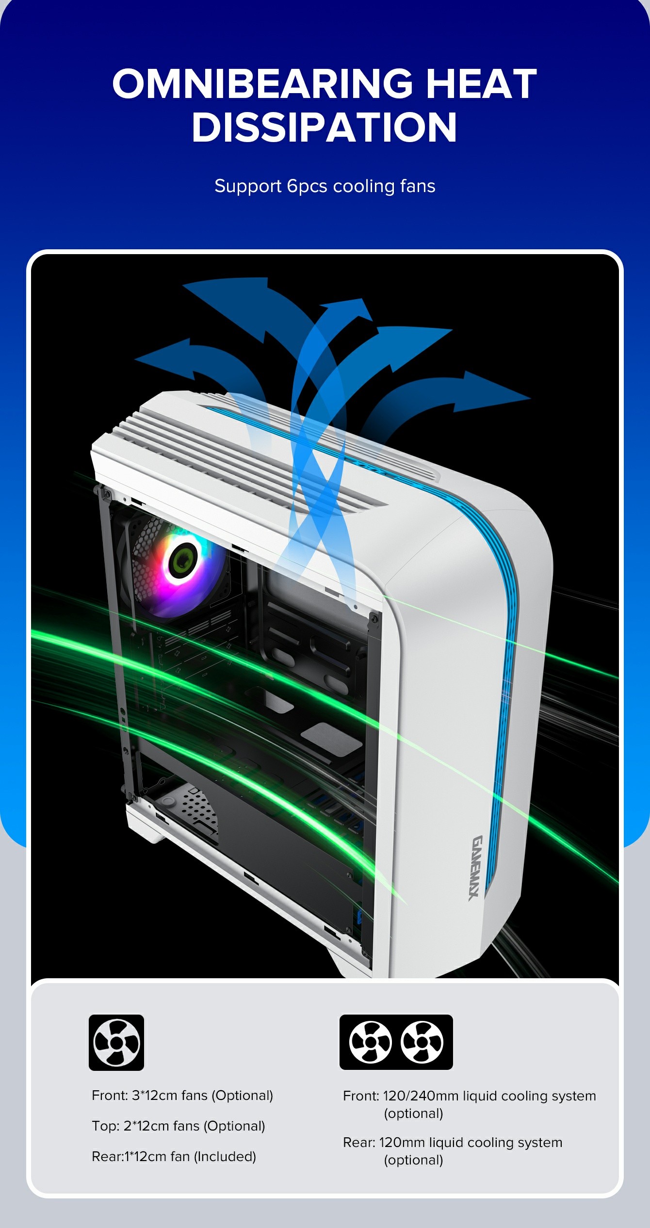 The cooling system allows for up to 6 x 120mm fans, or 3 x 120mm fans and a 240mm water cooling radiator.