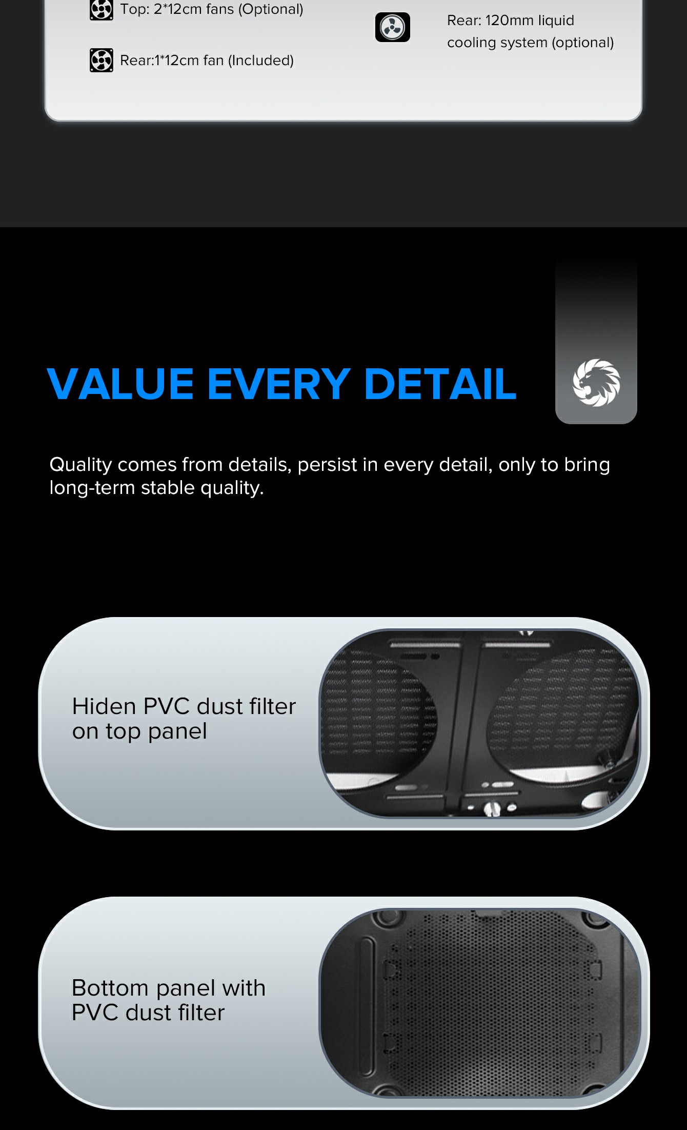 Water cooling support - 240mm watercooling support or 3 x 120mm fan cooling on front