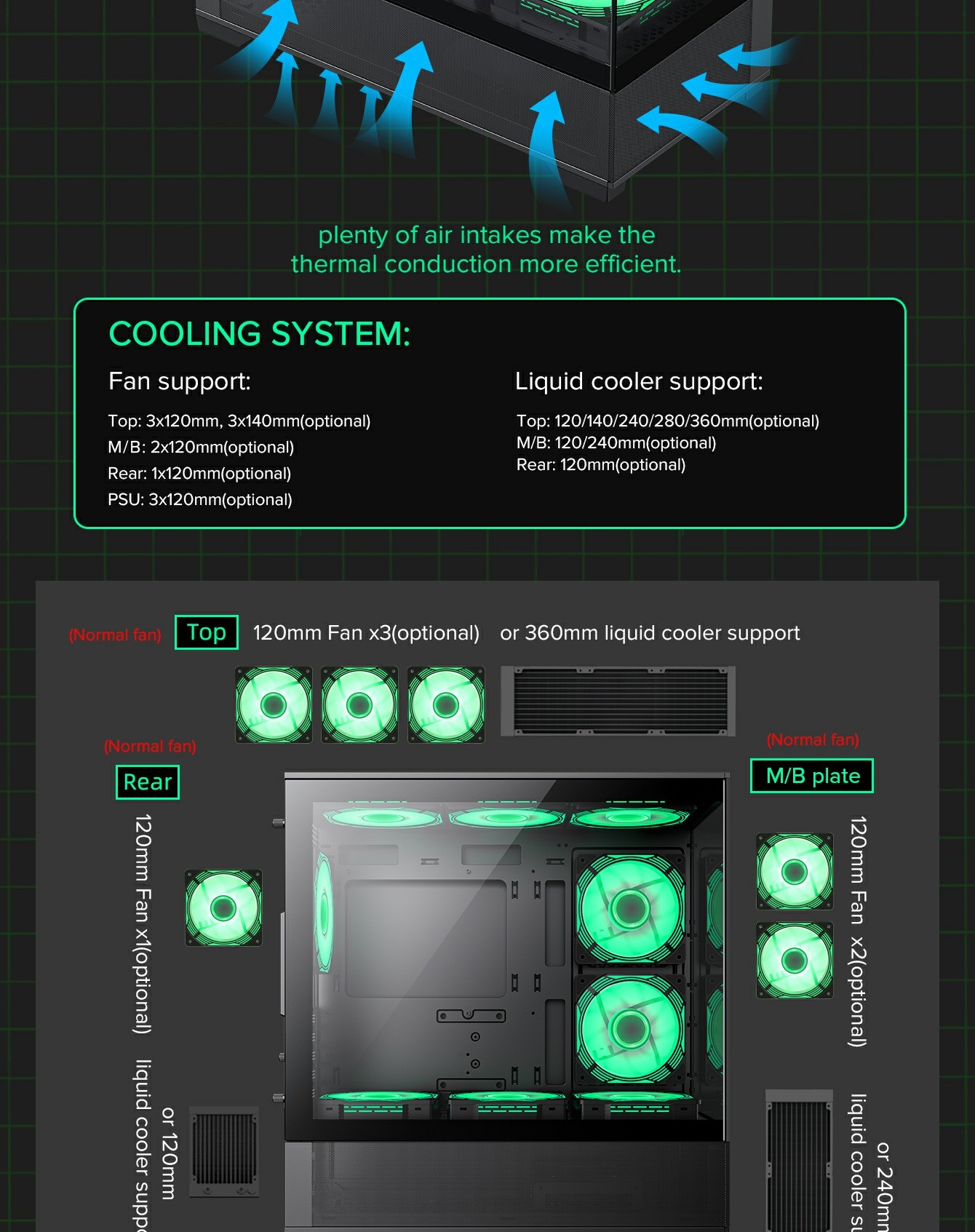 | PSU Cover | 3x120mm (Reverse fan blade)(Fan optional) | |