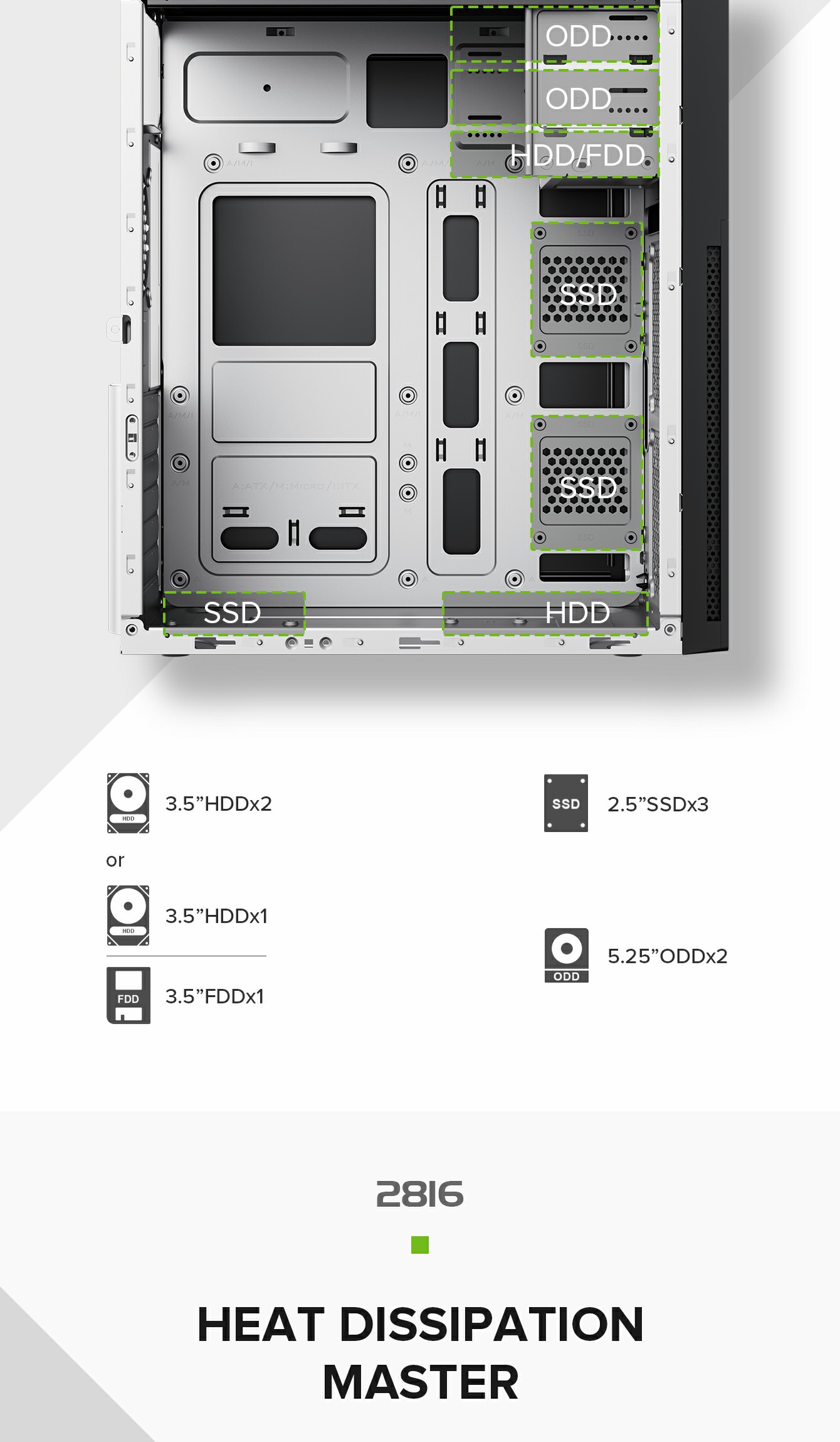 2816 is One of the Smallest ATX Computer cases, with an upgraded featured Chassis Design, 2x12cm fan potion to provide multi-cooling options for the PC system