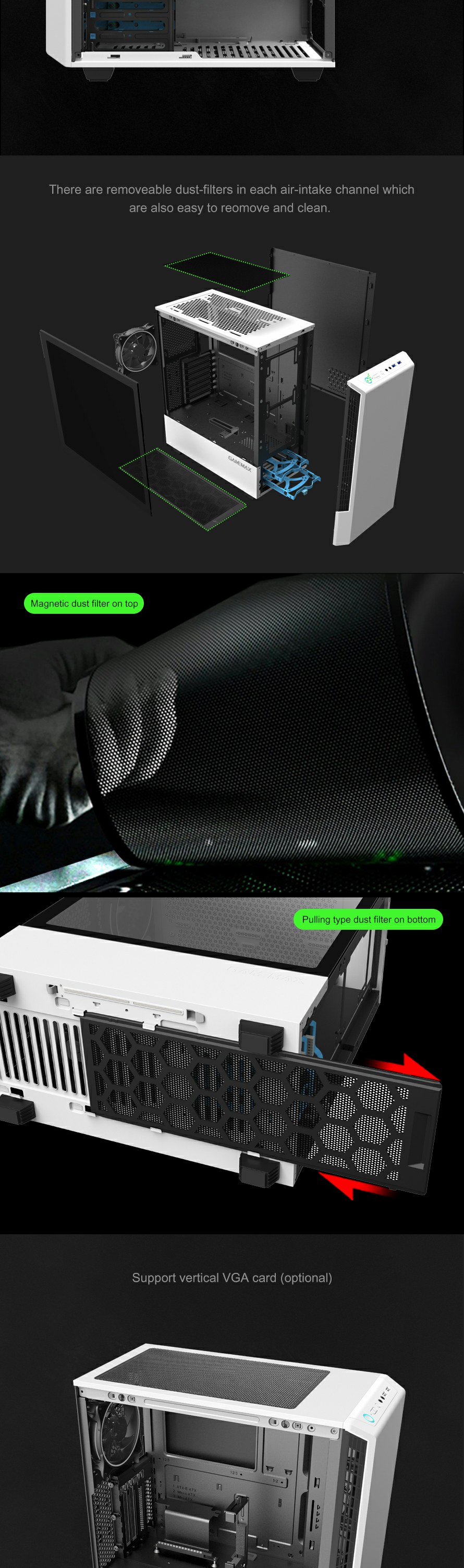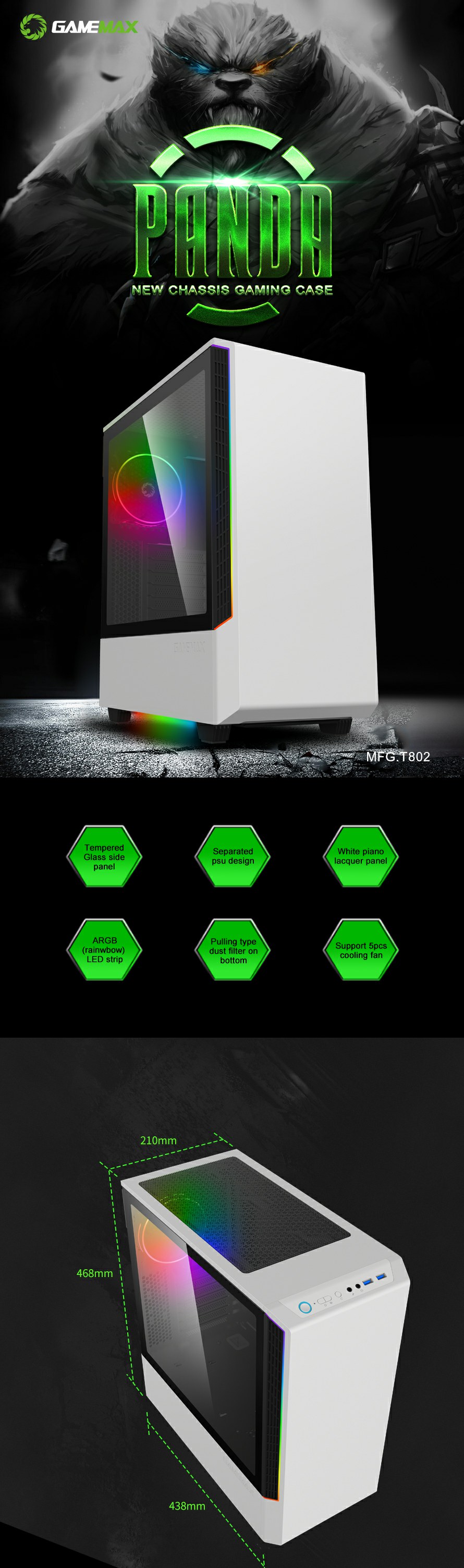 Includes 3x ARGB LED strips and 1xPCS ARGB 12cm Rainbow fan pre-installed to enhance the aesthetics of your build as seen through the 8002's stunning tempered glass panel.also Panda model has optional vertical graphic card holder to provide flexible installed position.