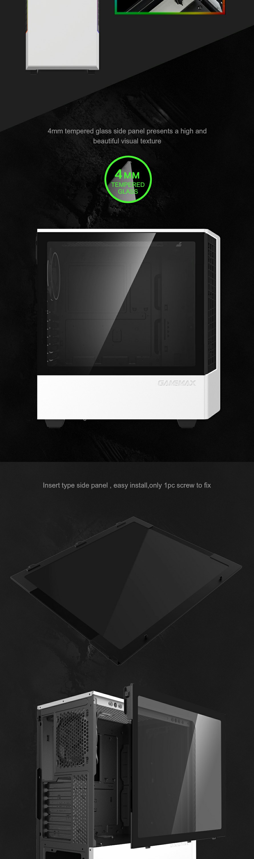 The 8002 compact mid-tower case features a unique one-pcs screw easy open glass side window, and along with top and bottom ARGB strips.