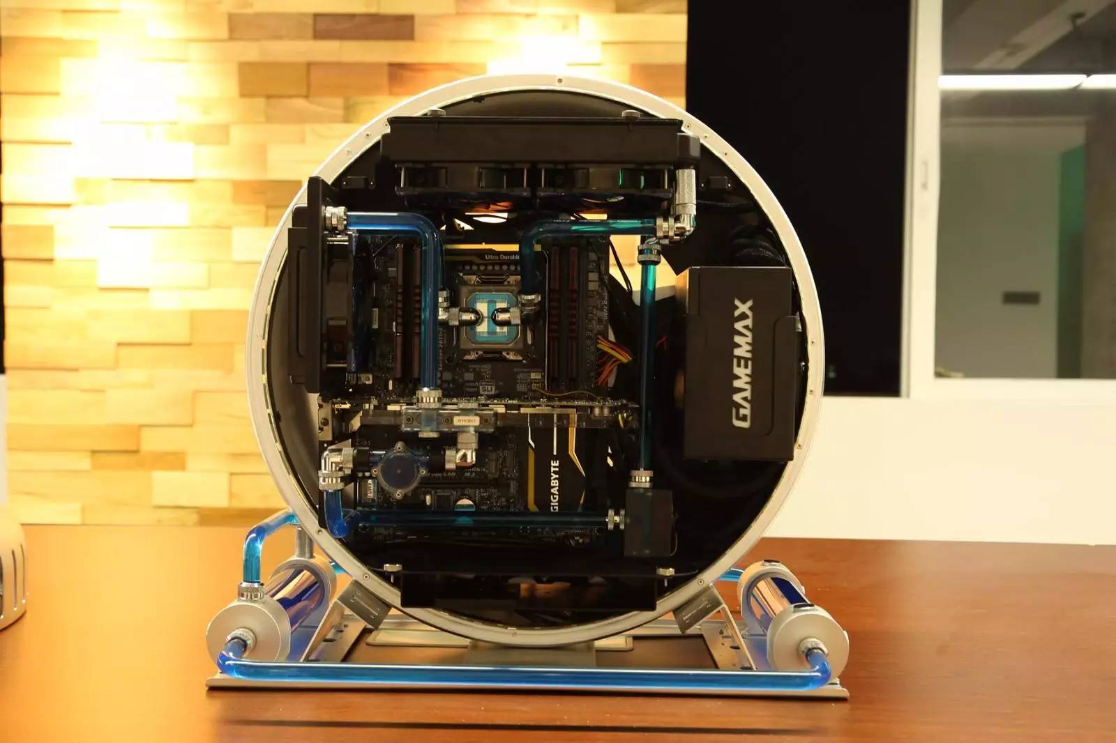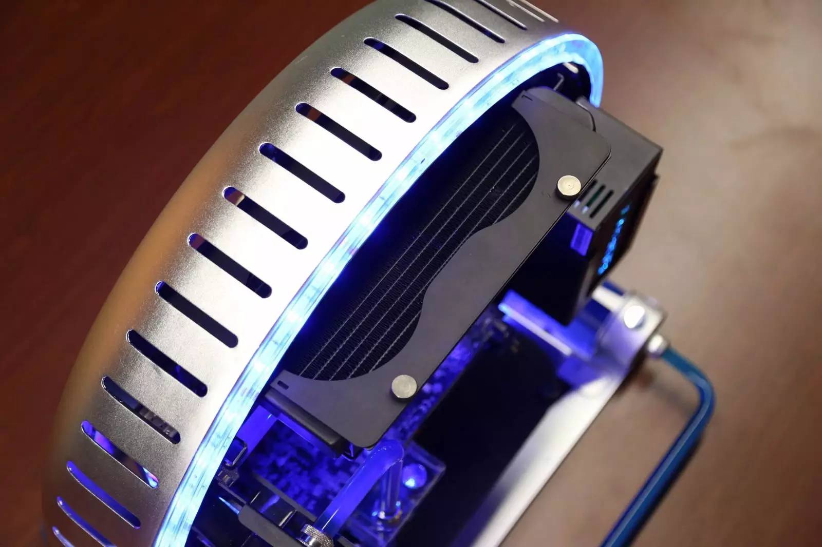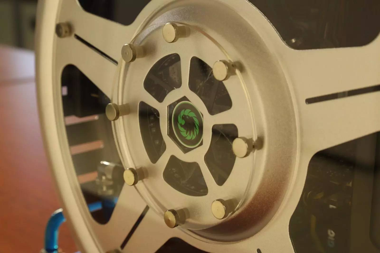 盖上外盖,LED风扇与水冷的蓝色光芒透过五辐条式轮辋显现出来。