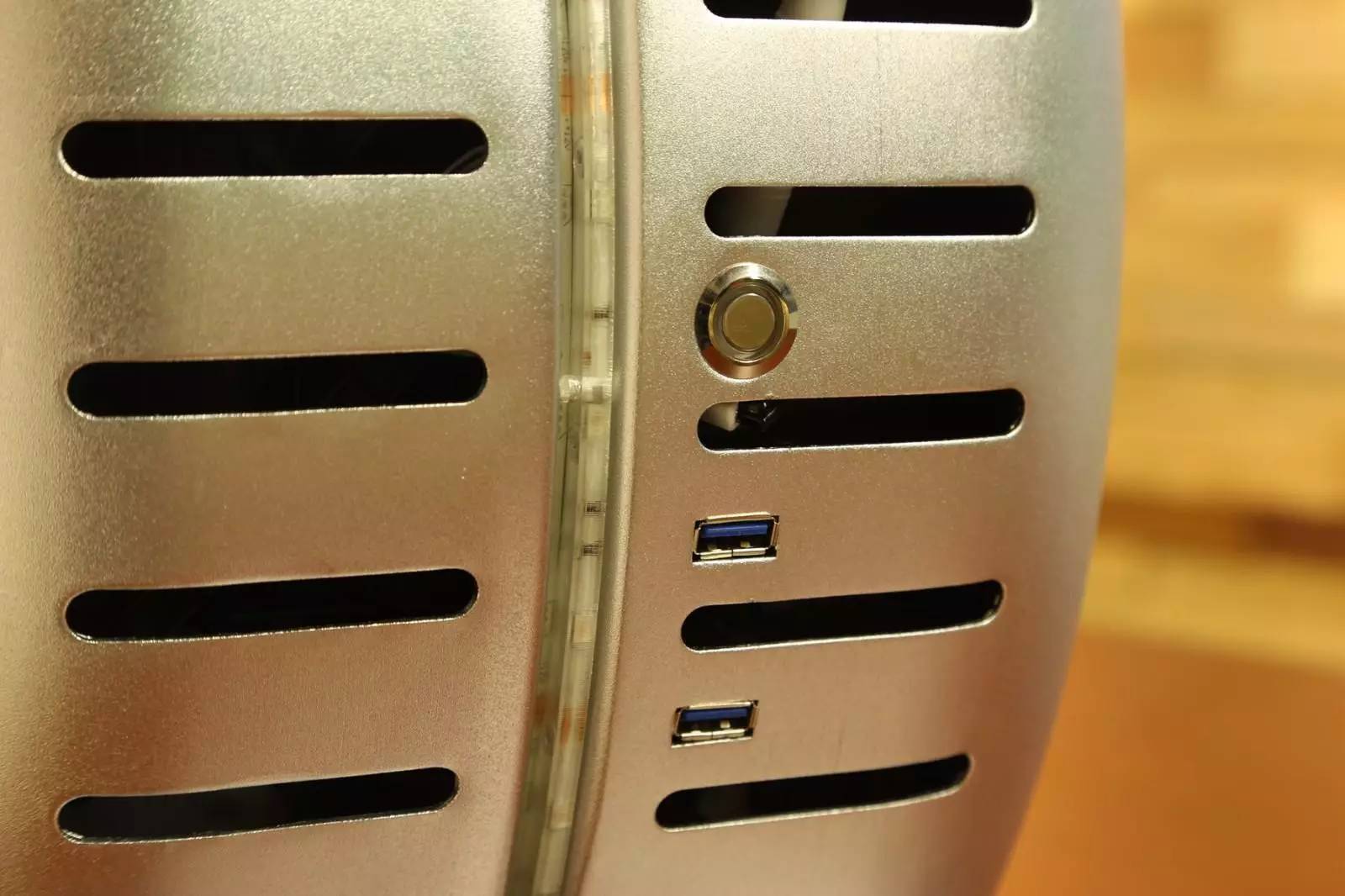 机箱的I/O面板,与轮胎完美结合,不仔细看还真难以分辨。由上至下依次是开机按键与两个USB3.0插口。