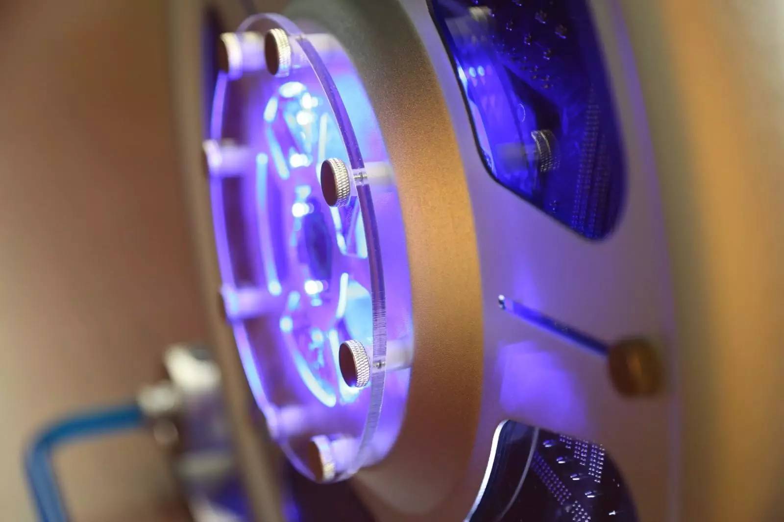 “轮身”采用现代汽车工业美学,设计了五辐条式轮辋和按圆形分布的双层梯形亚克力材质的侧头板,配合8个“螺栓”,整体圆润和谐,独树一帜。