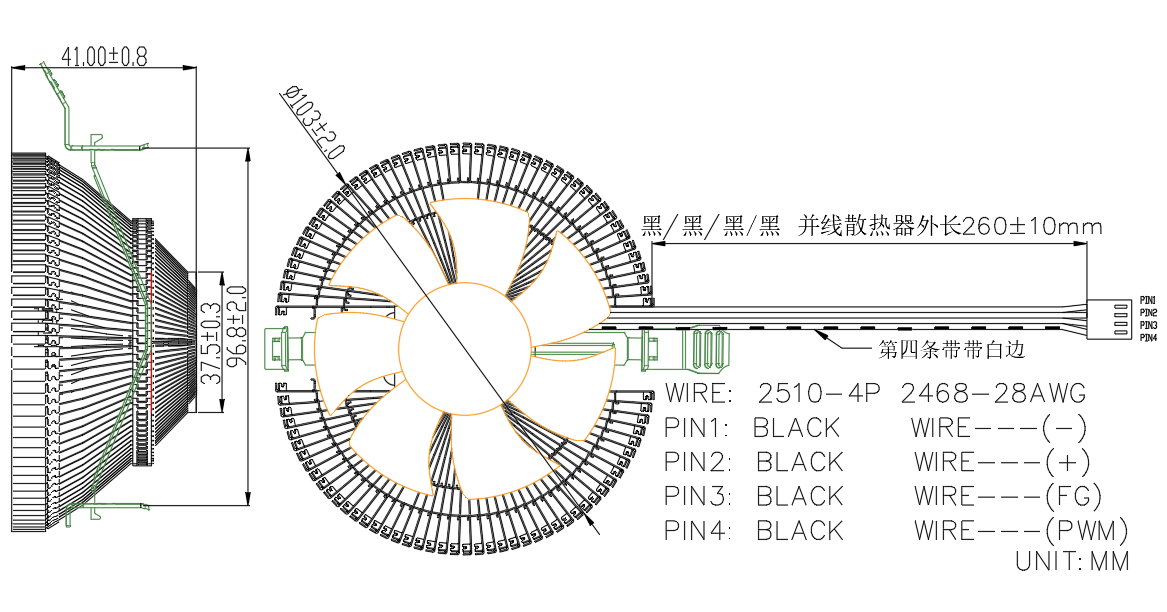 LEAD WIRE(线材) | 2510-4P 2468-28AWG 黑黑黑黑并线全长300±10mm(散热器外长260±10mm) BLACK WIRE NEGATIVE (-) BLACK WIRE POSITIVE (+) BLACK WIRE POSITIVE (FG) BLACK WIRE POSITIVE (PWM) |