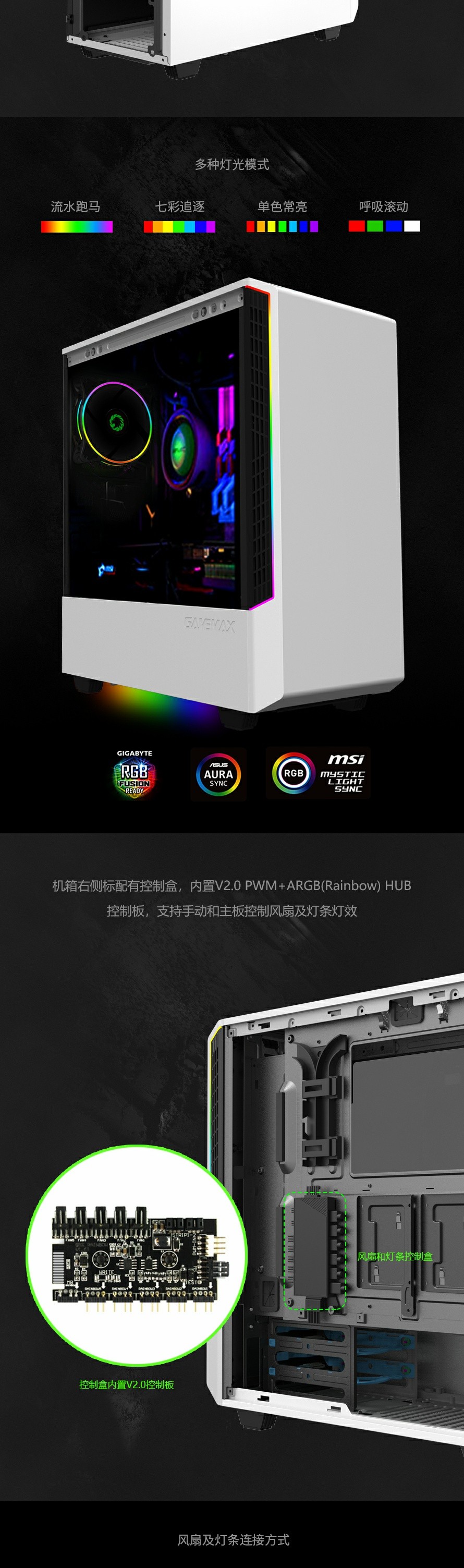 前面板及机箱下方可选ARGB灯条,后部有12cm风扇,您可以通过ARGB HUB轻松控制ARGB照明和风扇。并支持同步主板ARGB发光功能