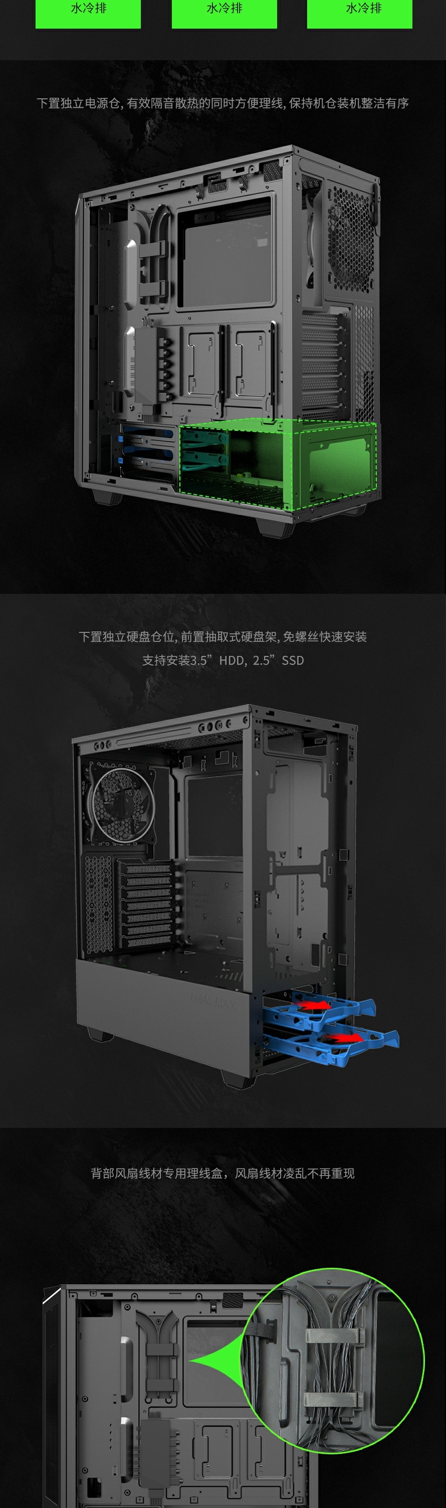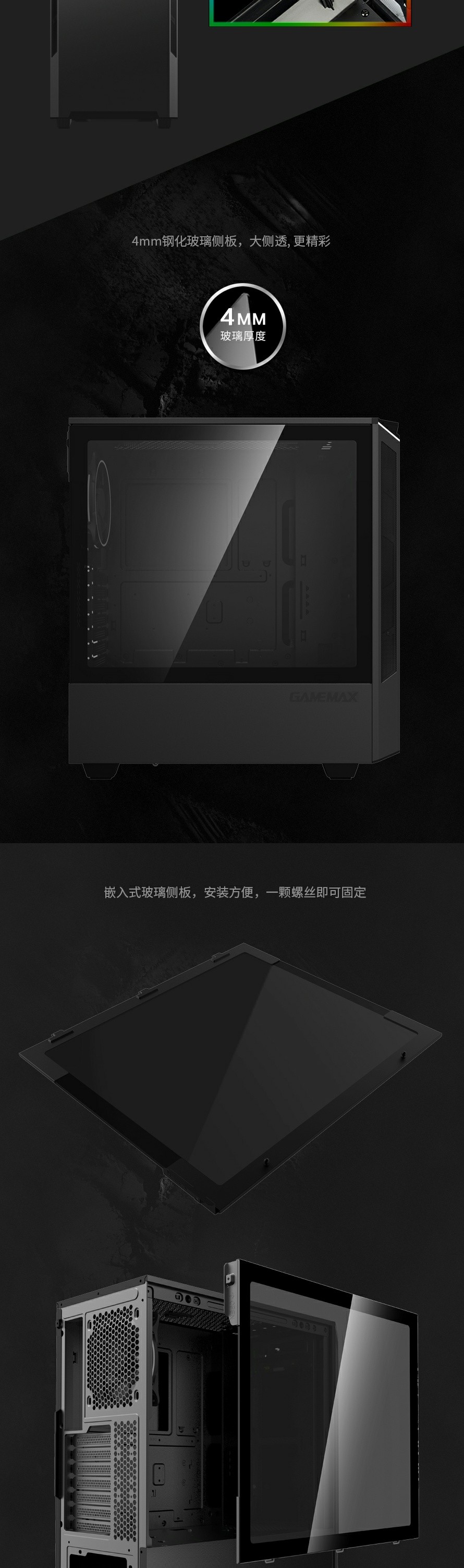 8001中塔式机箱具有独特的单颗易拧玻璃侧窗,并使用0.8mm的环保钢板。