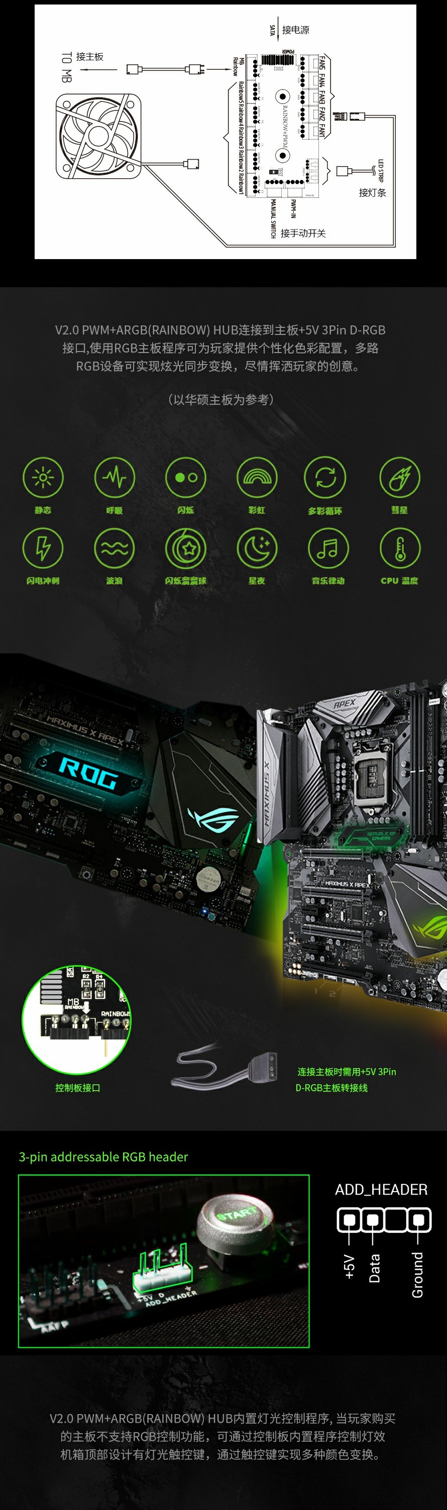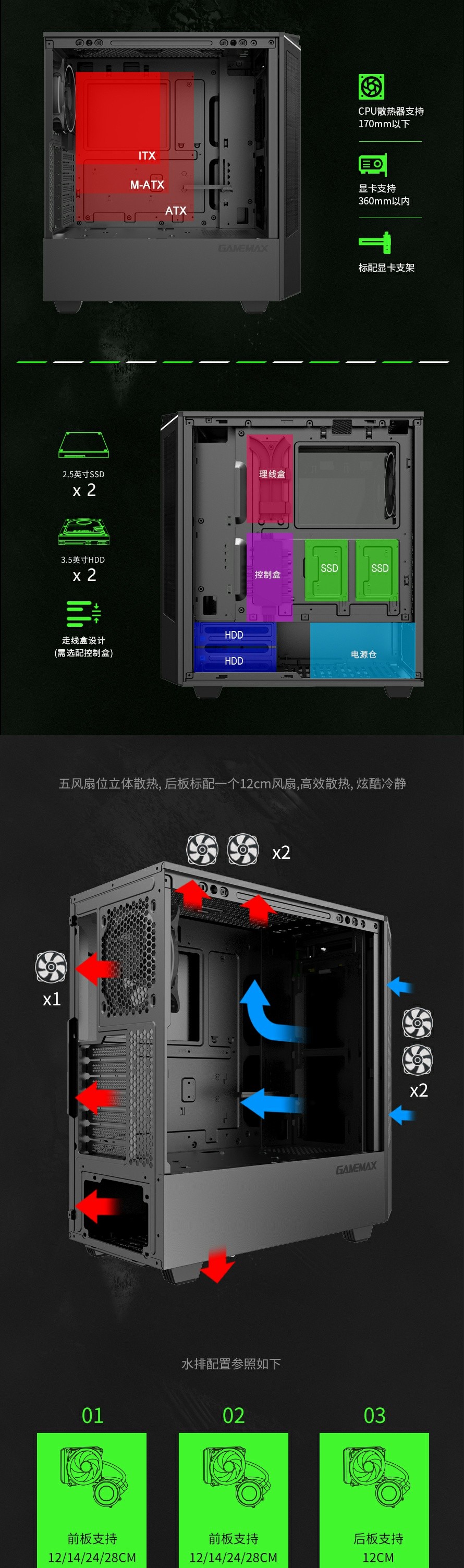 前面板上下可选有ARGB灯条,后部有12cm风扇,您可以通过ARGB HUB轻松控制ARGB照明和风扇。并支持同步主板ARGB发光功能