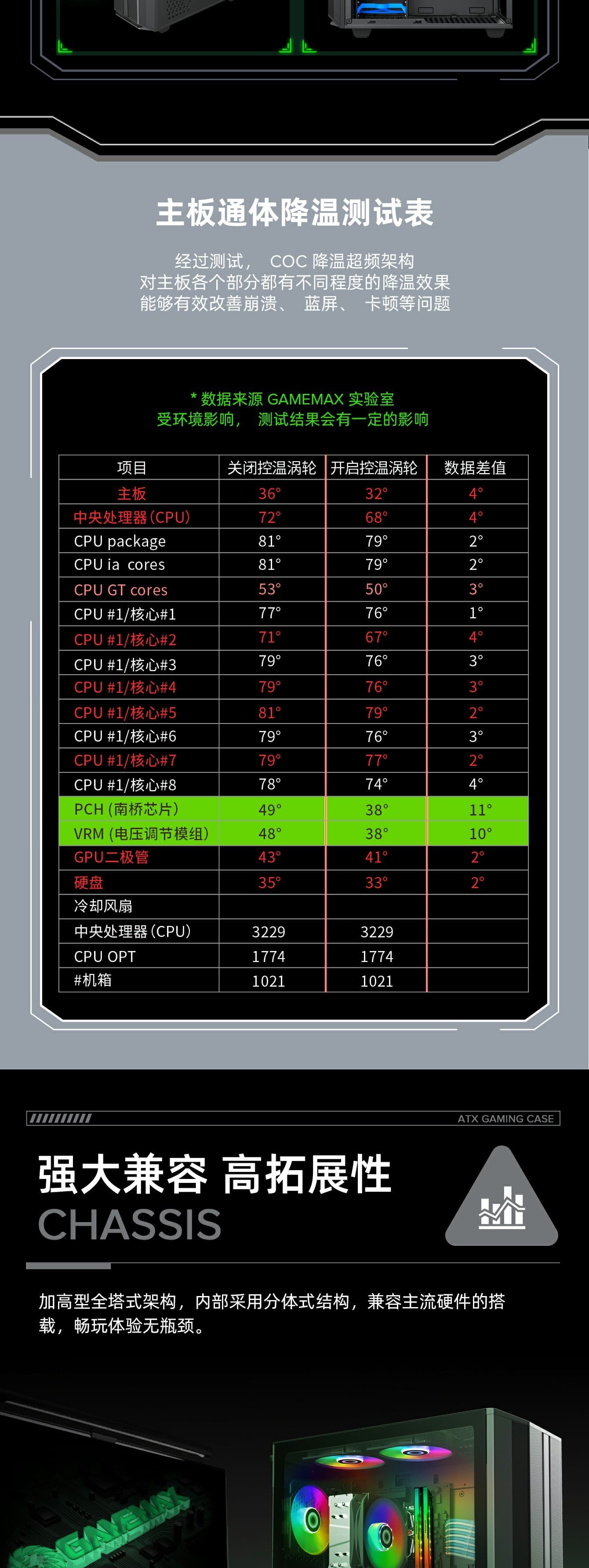 COC(Cooling & Overclocking)涡轮风扇、T型定向风道、主动散热系统、独家专利设计