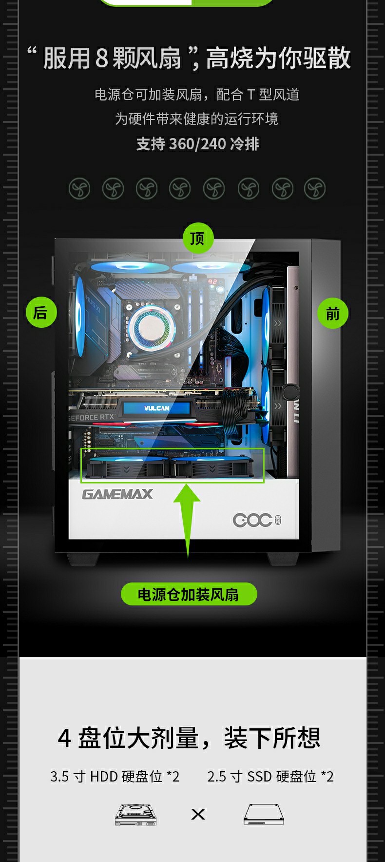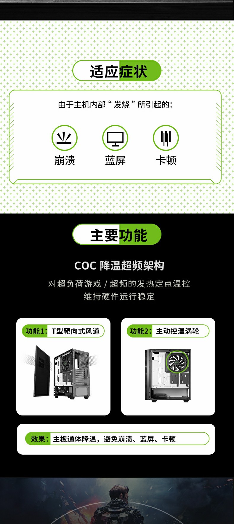 3609有"T" 形靶向式风道,通过具有针对性的全新风道,为硬件、主板降温,避免主板电压模组“发烧”才能有效治疗崩溃,蓝屏各卡顿问题。