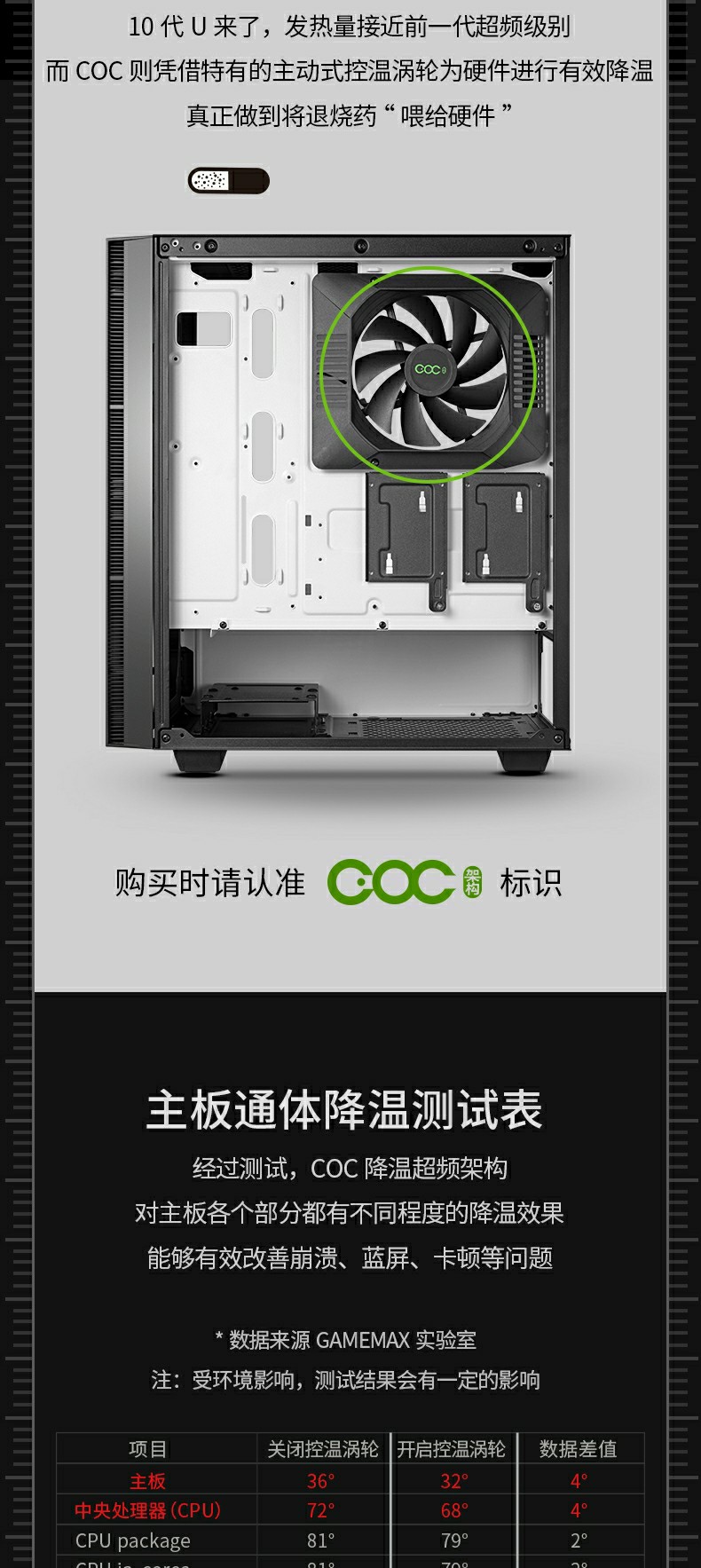 3609 布洛芬C1. 带有COC全新架构。 控温涡轮,主动出击, 10代CPU来了,发热量接近前一代超频级别,而COC则凭借主动式控温涡轮为硬件进行有效降温,真正做对不起退烧药“喂给硬件“