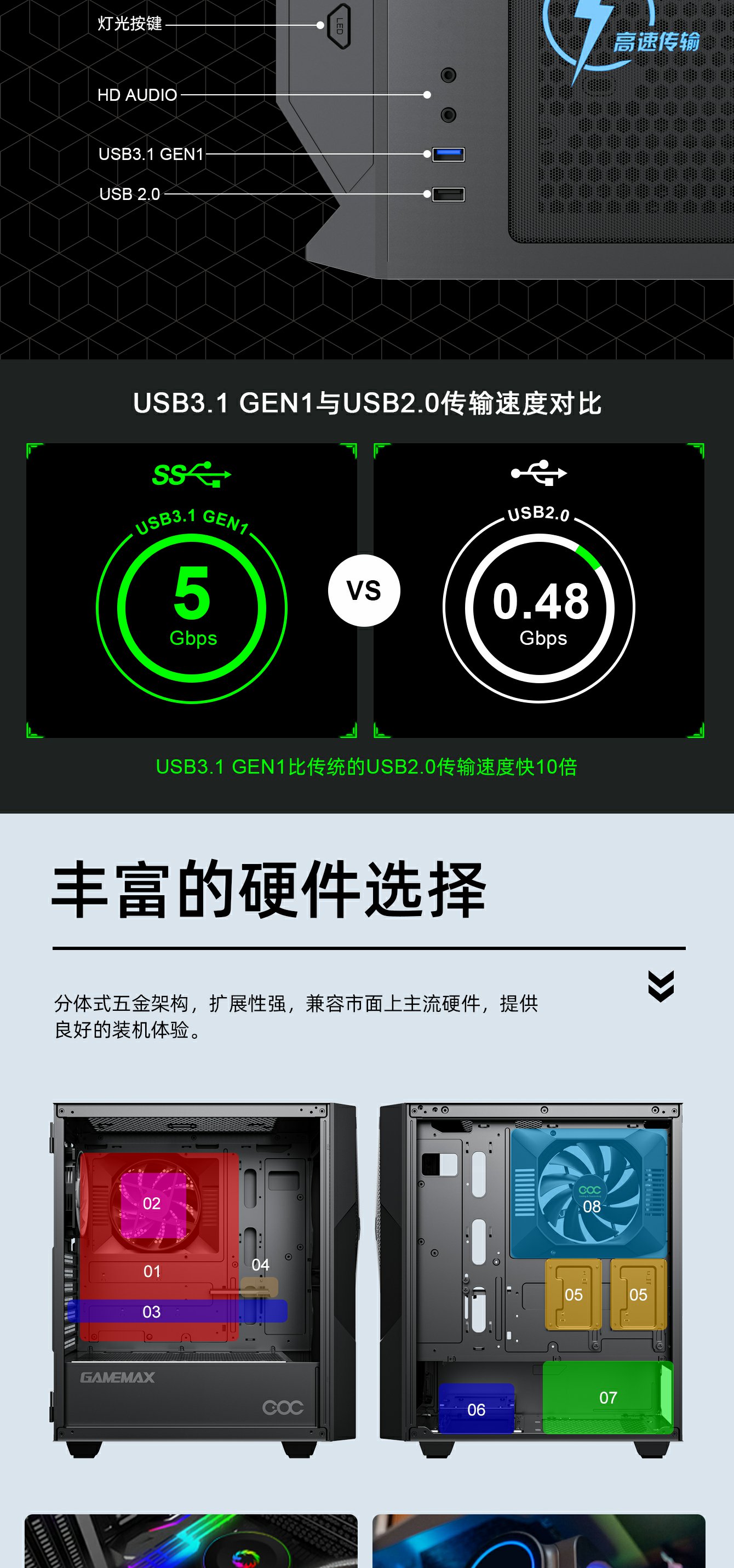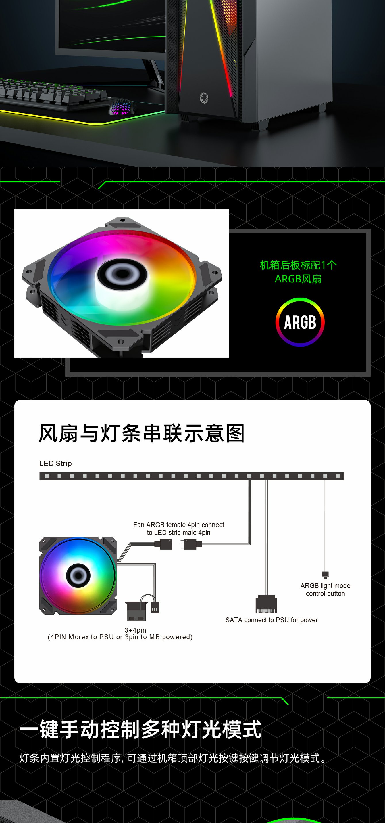 最多可支持8个风扇,电源仓可加装风扇,配合T形风道,为硬件带来健康的运行环境。选配有带有3针ARGB接头的光谱RGB集线器,可直接连接到您的主板,允许您通过主板提供的软件控制风扇和LED灯条同步。