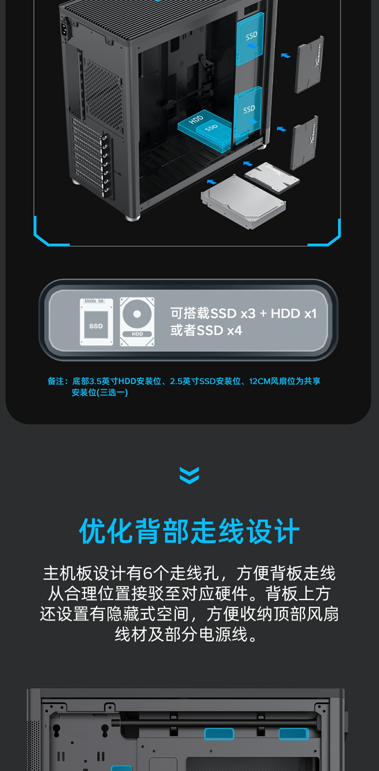 主机板仓采用区块模块化设计,优化线材管理,充分利用内部空间。