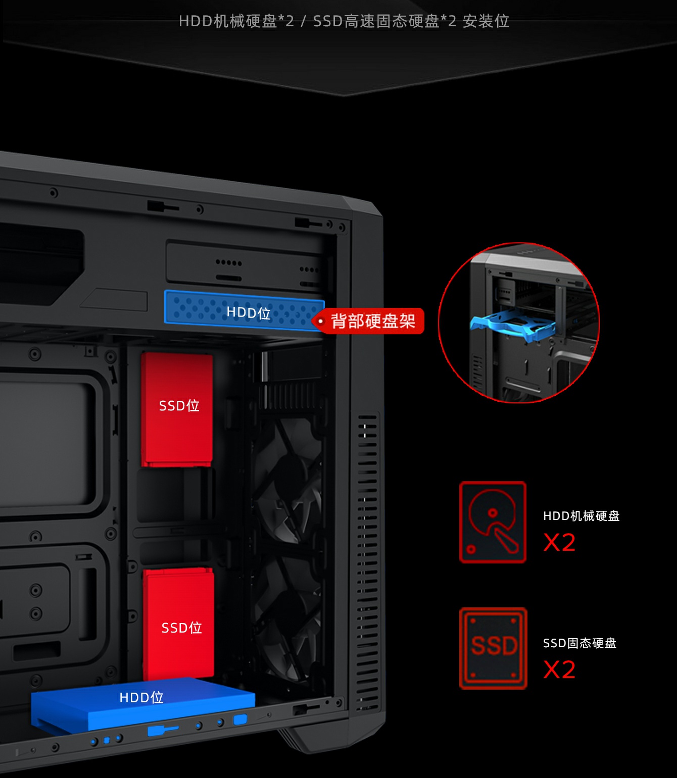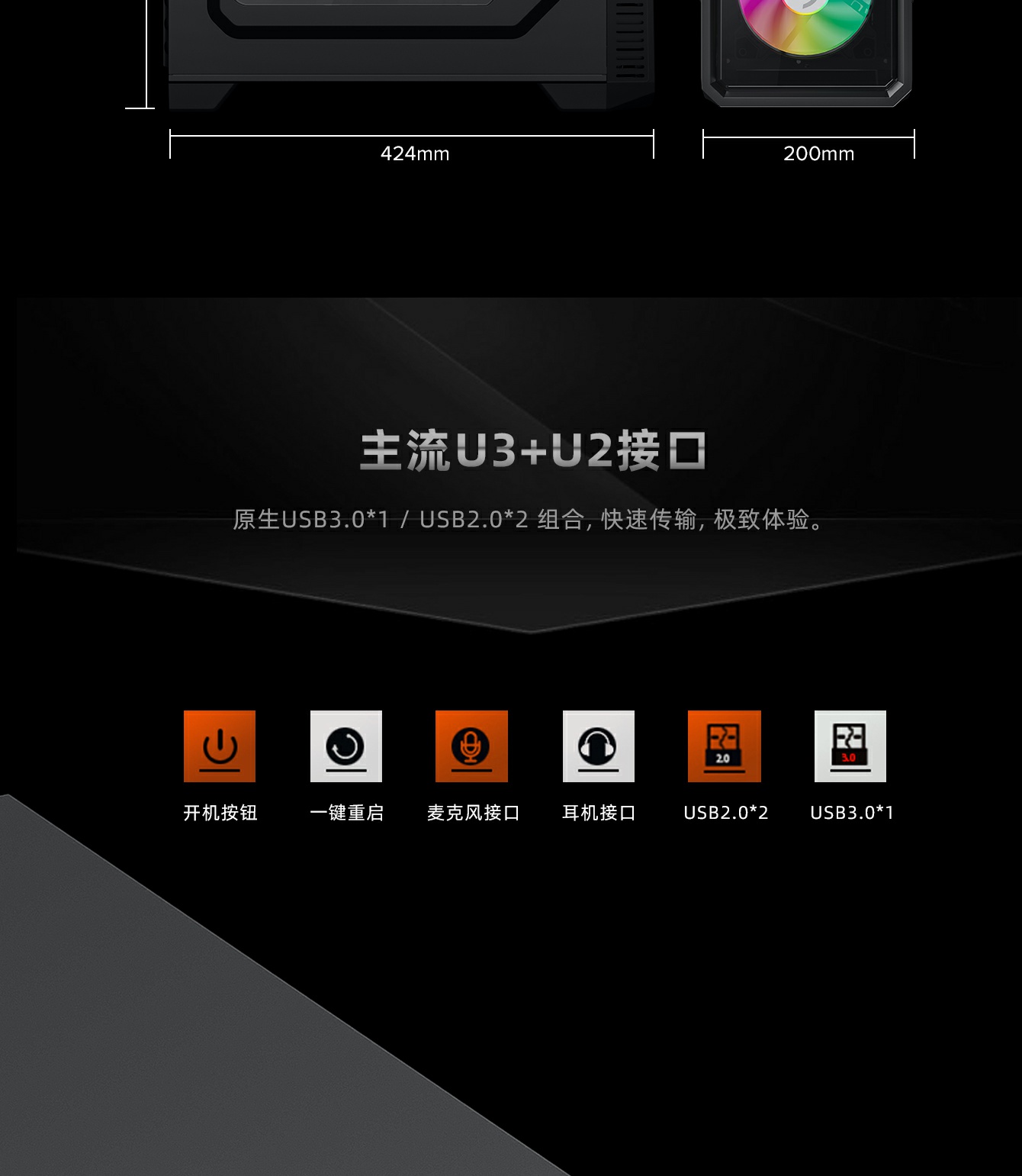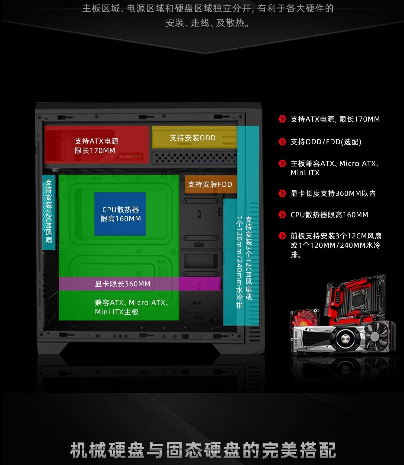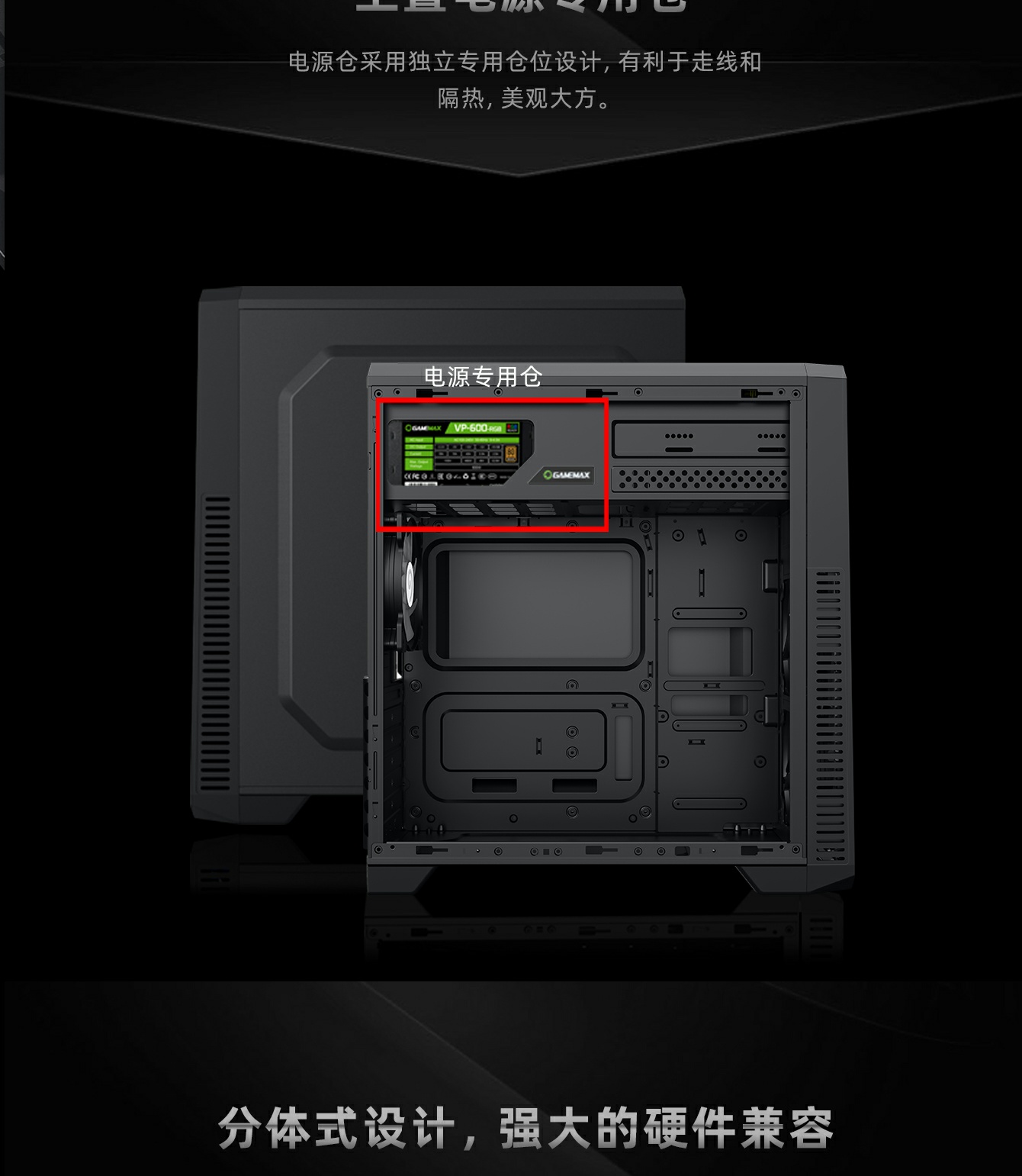 独特电源仓分开上置设计,电源线长很容易管理