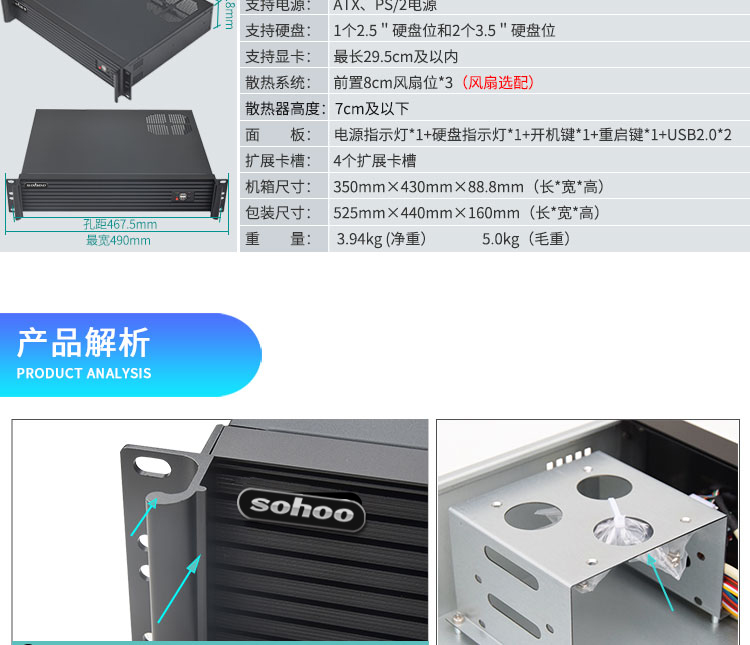 | 机箱尺寸D*W*H(mm) | 350*430*88.8mm(不含挂耳和把手) | ||
