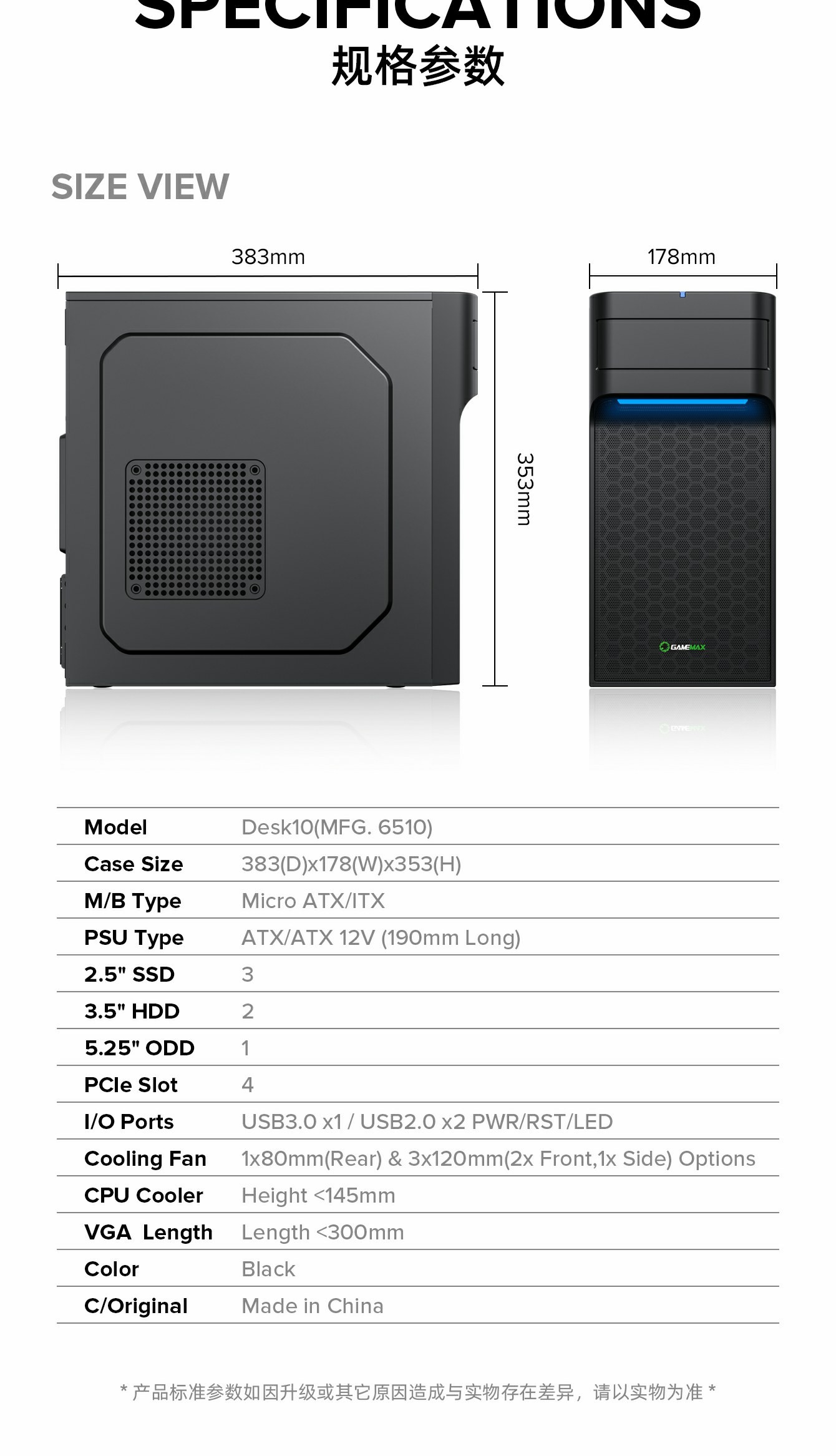 | 尺寸 | Chassis | (L)325*(W)170*(H)350mm |