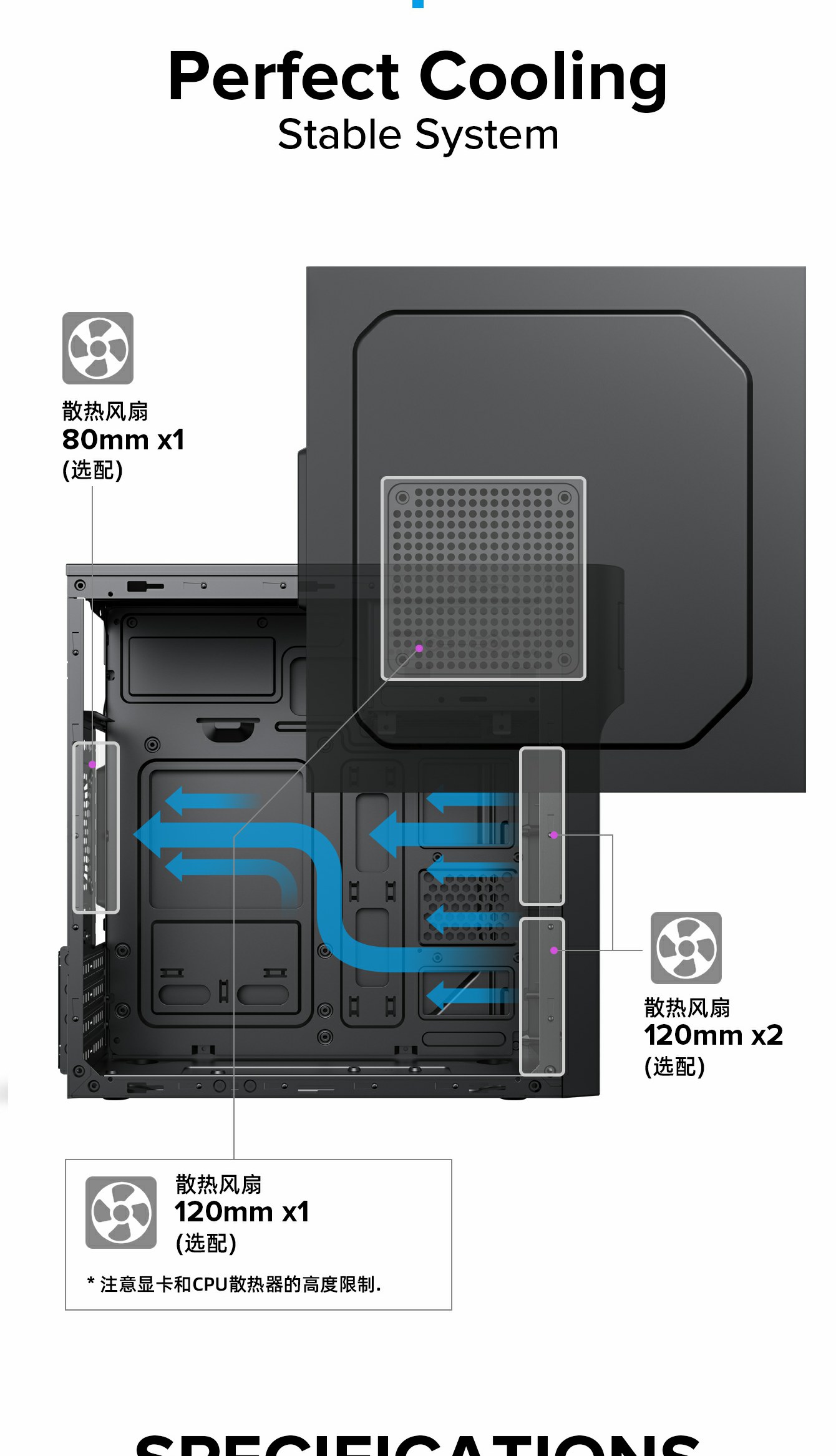 | 散热位支持 | Front | 2x120/92/80mm(Fan optional) |