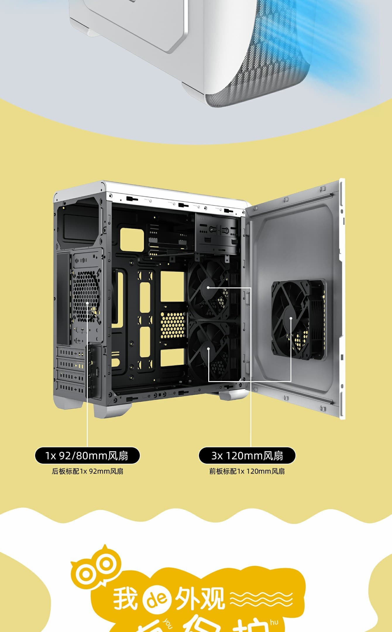 | 散热位支持 | Front | 2x120/92/80mm(Fan optional) |