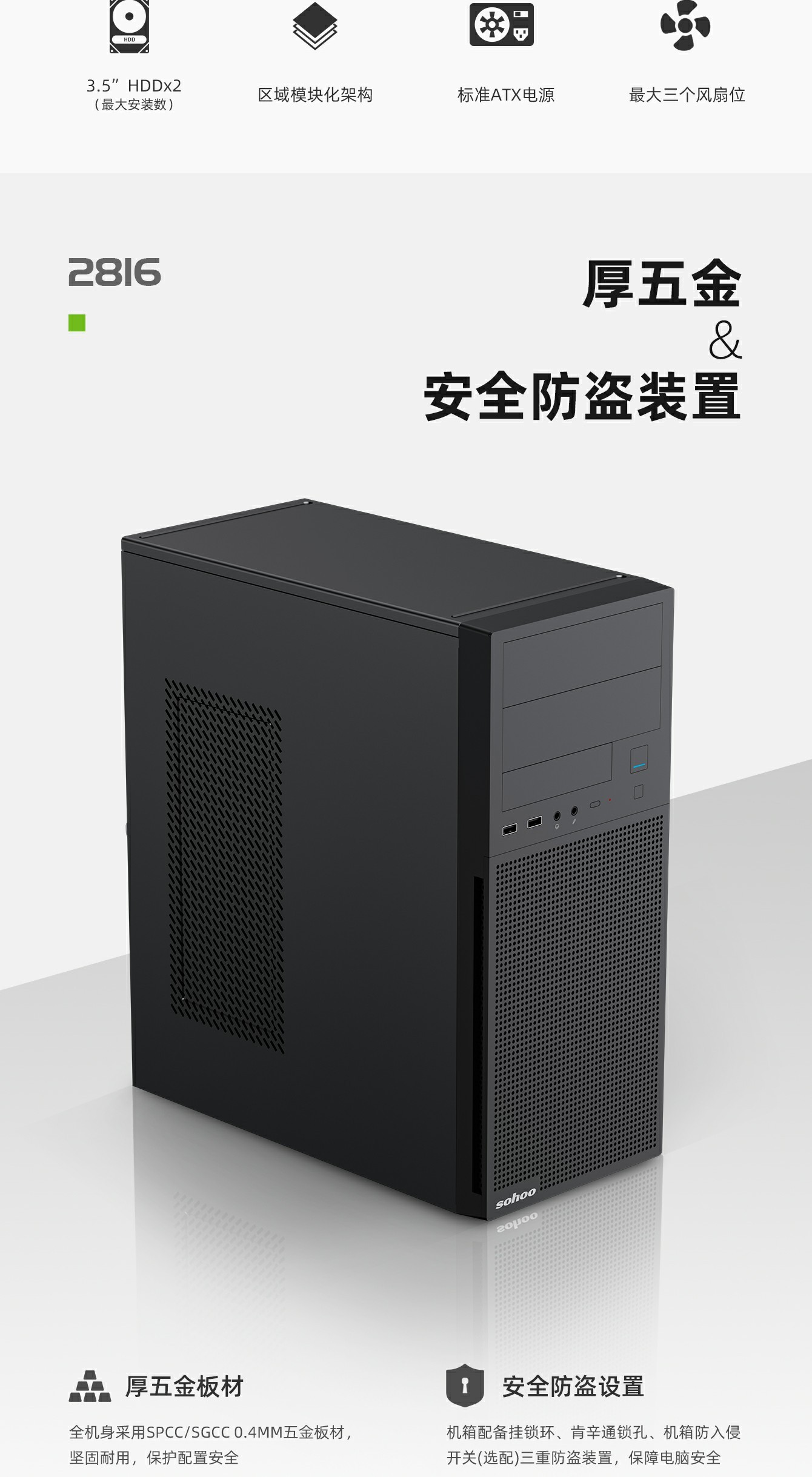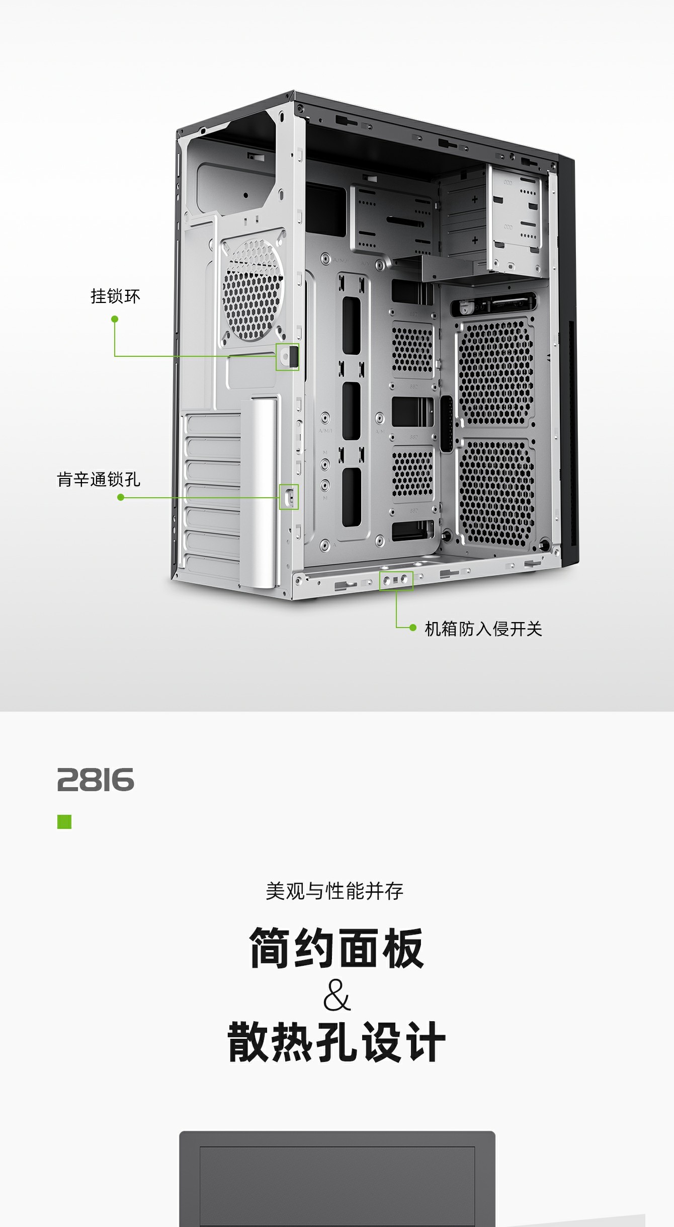 2816是最小的ATX电脑机箱之一,采用升级的机箱设计,前置2x12厘米风扇位,为电脑系统提供多种冷却选项